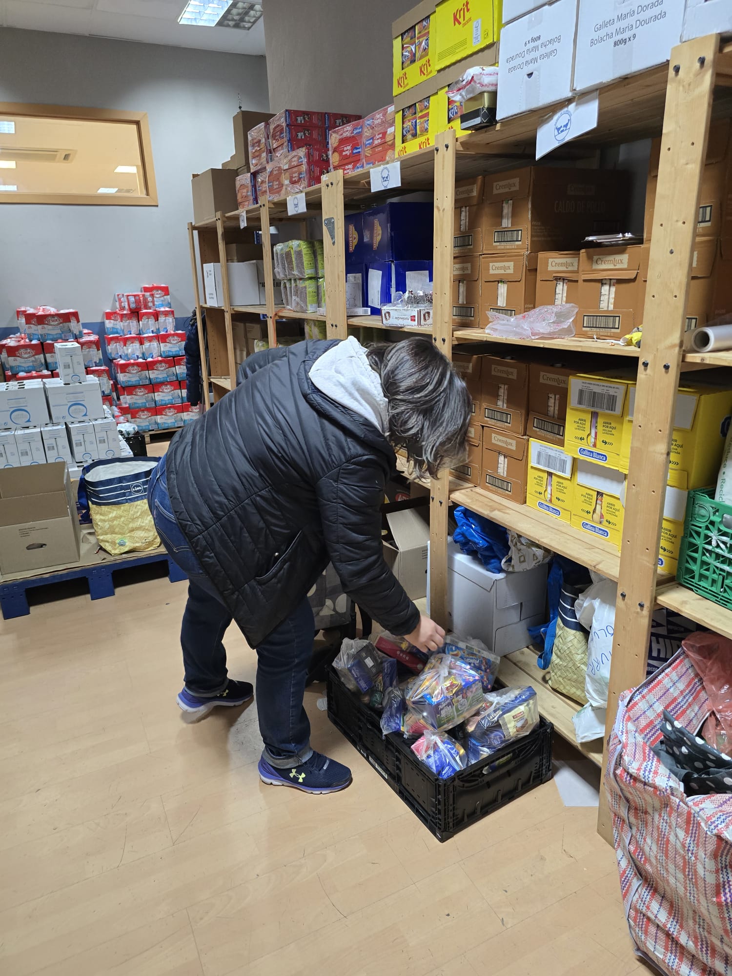 Una vez al mes se descarga un camión con todos los alimentos recibidos del Banco de alimentos y la ayuda de los voluntarios es siempre muy bien recibida para poder mover los alimentos del camión al almacén.