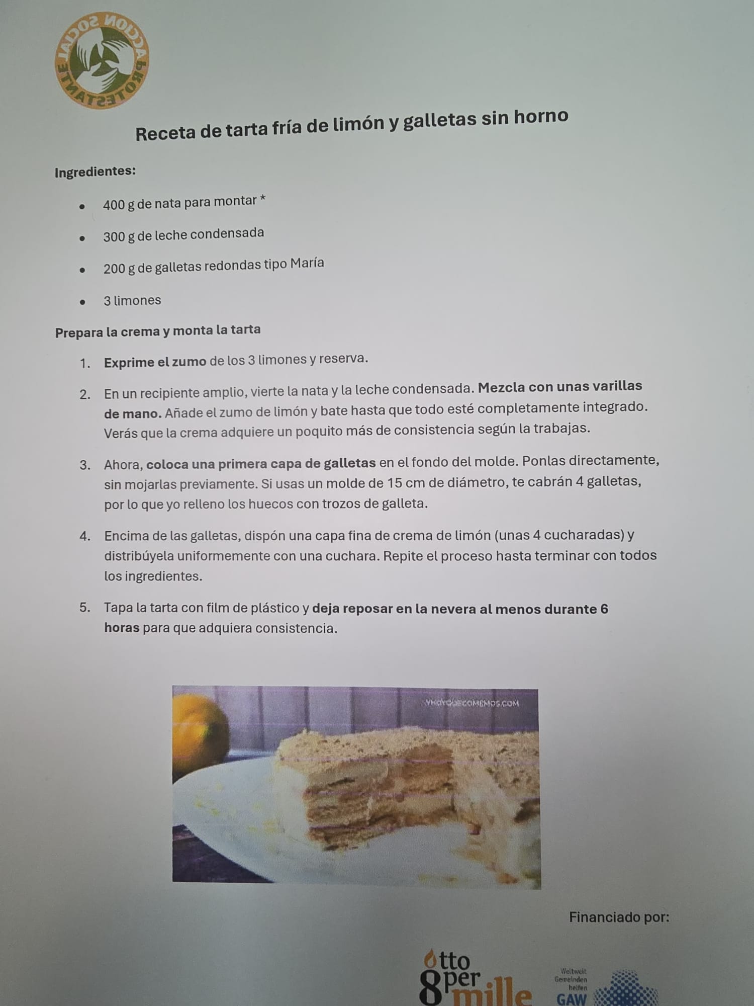 Esta semana el Taller de repostería del Espacio de Mujeres ha consistido en la elaboración de una tarta de galletas, limón y leche condensada.